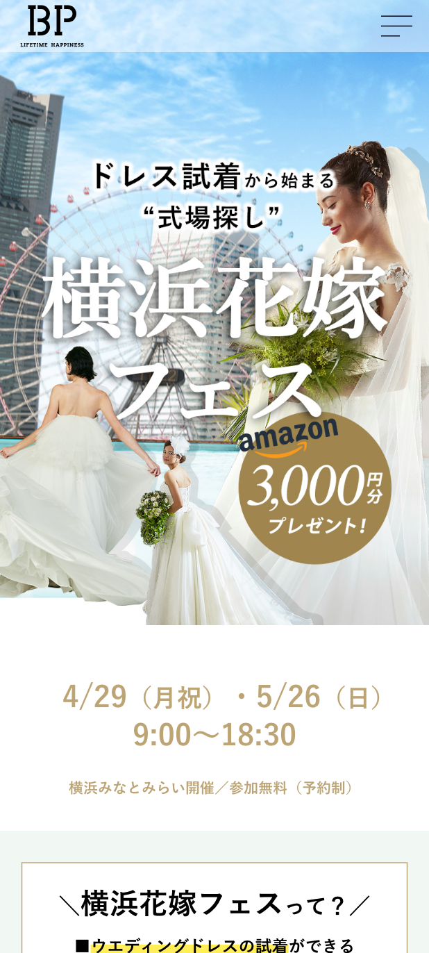 「ドレス試着から始まる結婚式場探し」をキャッチコピーとした、株式会社BPの広告ページを制作しました。